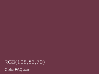 RGB 108,53,70 Color is a normal rose color and the nearest color is Catawba #703642. Hex code #6c3546 and RGB value is rgb(108,53,70). In RGB color space, this color is composed of 42% red, 21% green, 27% blue, In CMYK color space, this color is composed of 0% cyan, 51% magenta, 35% yellow , 58% black , In HSL color space, this color has a hue angle of 341° , 34% saturation and 32% lightness.
