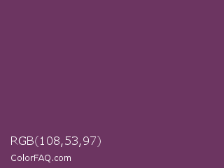 RGB 108,53,97 Color is a normal magenta color and the nearest color is Cosmic #76395d. Hex code #6c3561 and RGB value is rgb(108,53,97). In RGB color space, this color is composed of 42% red, 21% green, 38% blue, In CMYK color space, this color is composed of 0% cyan, 51% magenta, 10% yellow , 58% black , In HSL color space, this color has a hue angle of 312° , 34% saturation and 32% lightness.