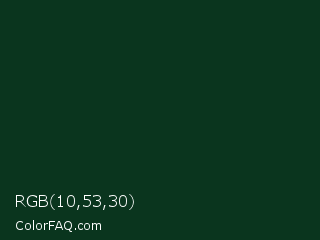 RGB 10,53,30 Color is a very dark green color and the nearest color is Bottle Green #093624. Hex code #0a351e and RGB value is rgb(10,53,30). In RGB color space, this color is composed of 4% red, 21% green, 12% blue, In CMYK color space, this color is composed of 81% cyan, 0% magenta, 43% yellow , 79% black , In HSL color space, this color has a hue angle of 148° , 68% saturation and 12% lightness.