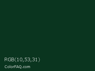 RGB 10,53,31 Color is a very dark green color and the nearest color is Bottle Green #093624. Hex code #0a351f and RGB value is rgb(10,53,31). In RGB color space, this color is composed of 4% red, 21% green, 12% blue, In CMYK color space, this color is composed of 81% cyan, 0% magenta, 42% yellow , 79% black , In HSL color space, this color has a hue angle of 149° , 68% saturation and 12% lightness.