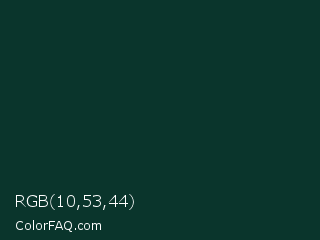RGB 10,53,44 Color is a very dark cyan color and the nearest color is Bottle Green #093624. Hex code #0a352c and RGB value is rgb(10,53,44). In RGB color space, this color is composed of 4% red, 21% green, 17% blue, In CMYK color space, this color is composed of 81% cyan, 0% magenta, 17% yellow , 79% black , In HSL color space, this color has a hue angle of 167° , 68% saturation and 12% lightness.