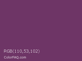 RGB 110,53,102 Color is a normal magenta color and the nearest color is Byzantium #702963. Hex code #6e3566 and RGB value is rgb(110,53,102). In RGB color space, this color is composed of 43% red, 21% green, 40% blue, In CMYK color space, this color is composed of 0% cyan, 52% magenta, 7% yellow , 57% black , In HSL color space, this color has a hue angle of 308° , 35% saturation and 32% lightness.