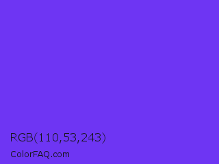RGB 110,53,243 Color is a normal indigo color and the nearest color is Blue Violet #8a2be2. Hex code #6e35f3 and RGB value is rgb(110,53,243). In RGB color space, this color is composed of 43% red, 21% green, 95% blue, In CMYK color space, this color is composed of 55% cyan, 78% magenta, 0% yellow , 5% black , In HSL color space, this color has a hue angle of 258° , 89% saturation and 58% lightness.