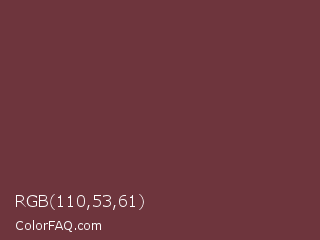 RGB 110,53,61 Color is a normal red color and the nearest color is Catawba #703642. Hex code #6e353d and RGB value is rgb(110,53,61). In RGB color space, this color is composed of 43% red, 21% green, 24% blue, In CMYK color space, this color is composed of 0% cyan, 52% magenta, 45% yellow , 57% black , In HSL color space, this color has a hue angle of 352° , 35% saturation and 32% lightness.