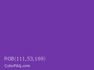 RGB 111,53,169 Color is a normal violet color and the nearest color is Grape #6f2da8. Hex code #6f35a9 and RGB value is rgb(111,53,169). In RGB color space, this color is composed of 44% red, 21% green, 66% blue, In CMYK color space, this color is composed of 34% cyan, 69% magenta, 0% yellow , 34% black , In HSL color space, this color has a hue angle of 270° , 52% saturation and 44% lightness.