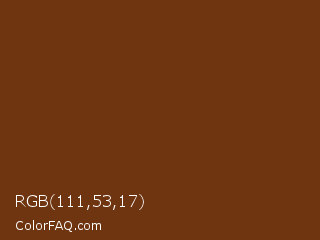 RGB 111,53,17 Color is a dark orange color and the nearest color is Peanut #782f16. Hex code #6f3511 and RGB value is rgb(111,53,17). In RGB color space, this color is composed of 44% red, 21% green, 7% blue, In CMYK color space, this color is composed of 0% cyan, 52% magenta, 85% yellow , 56% black , In HSL color space, this color has a hue angle of 23° , 73% saturation and 25% lightness.
