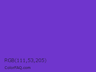 RGB 111,53,205 Color is a normal violet color and the nearest color is Purple Heart Crayola #652dc1. Hex code #6f35cd and RGB value is rgb(111,53,205). In RGB color space, this color is composed of 44% red, 21% green, 80% blue, In CMYK color space, this color is composed of 46% cyan, 74% magenta, 0% yellow , 20% black , In HSL color space, this color has a hue angle of 263° , 60% saturation and 51% lightness.