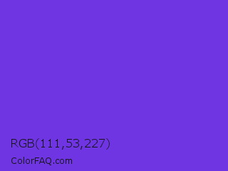 RGB 111,53,227 Color is a normal indigo color and the nearest color is Blue Violet #8a2be2. Hex code #6f35e3 and RGB value is rgb(111,53,227). In RGB color space, this color is composed of 44% red, 21% green, 89% blue, In CMYK color space, this color is composed of 51% cyan, 77% magenta, 0% yellow , 11% black , In HSL color space, this color has a hue angle of 260° , 76% saturation and 55% lightness.