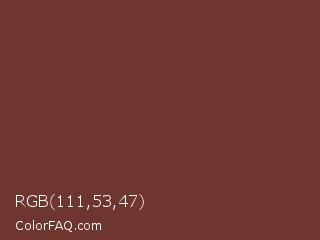 RGB 111,53,47 Color is a normal red color and the nearest color is Wine #722f37. Hex code #6f352f and RGB value is rgb(111,53,47). In RGB color space, this color is composed of 44% red, 21% green, 18% blue, In CMYK color space, this color is composed of 0% cyan, 52% magenta, 58% yellow , 56% black , In HSL color space, this color has a hue angle of 6° , 41% saturation and 31% lightness.