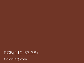 RGB 112,53,38 Color is a dark red color and the nearest color is Liver Organ #6c2e1f. Hex code #703526 and RGB value is rgb(112,53,38). In RGB color space, this color is composed of 44% red, 21% green, 15% blue, In CMYK color space, this color is composed of 0% cyan, 53% magenta, 66% yellow , 56% black , In HSL color space, this color has a hue angle of 12° , 49% saturation and 29% lightness.