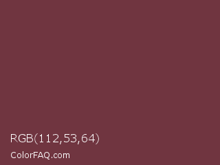 RGB 112,53,64 Color is a normal red color and the nearest color is Catawba #703642. Hex code #703540 and RGB value is rgb(112,53,64). In RGB color space, this color is composed of 44% red, 21% green, 25% blue, In CMYK color space, this color is composed of 0% cyan, 53% magenta, 43% yellow , 56% black , In HSL color space, this color has a hue angle of 349° , 36% saturation and 32% lightness.