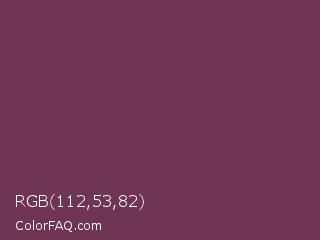 RGB 112,53,82 Color is a normal rose color and the nearest color is Ube Halaya #663854. Hex code #703552 and RGB value is rgb(112,53,82). In RGB color space, this color is composed of 44% red, 21% green, 32% blue, In CMYK color space, this color is composed of 0% cyan, 53% magenta, 27% yellow , 56% black , In HSL color space, this color has a hue angle of 331° , 36% saturation and 32% lightness.