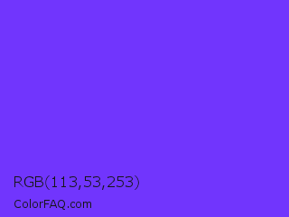 RGB 113,53,253 Color is a normal indigo color and the nearest color is Blue Violet #8a2be2. Hex code #7135fd and RGB value is rgb(113,53,253). In RGB color space, this color is composed of 44% red, 21% green, 99% blue, In CMYK color space, this color is composed of 55% cyan, 79% magenta, 0% yellow , 1% black , In HSL color space, this color has a hue angle of 258° , 98% saturation and 60% lightness.