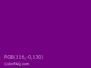 RGB 116,-0,130 Color is a dark magenta color and the nearest color is Patriarch #800080. Hex code #740082 and RGB value is rgb(116,-0,130). In RGB color space, this color is composed of 45% red, 0% green, 51% blue, In CMYK color space, this color is composed of 11% cyan, 100% magenta, 0% yellow , 49% black , In HSL color space, this color has a hue angle of 294° , 100% saturation and 25% lightness.