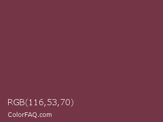 RGB 116,53,70 Color is a normal rose color and the nearest color is Catawba #703642. Hex code #743546 and RGB value is rgb(116,53,70). In RGB color space, this color is composed of 45% red, 21% green, 27% blue, In CMYK color space, this color is composed of 0% cyan, 54% magenta, 40% yellow , 55% black , In HSL color space, this color has a hue angle of 344° , 37% saturation and 33% lightness.