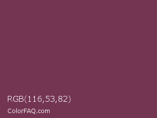 RGB 116,53,82 Color is a normal rose color and the nearest color is Cosmic #76395d. Hex code #743552 and RGB value is rgb(116,53,82). In RGB color space, this color is composed of 45% red, 21% green, 32% blue, In CMYK color space, this color is composed of 0% cyan, 54% magenta, 29% yellow , 55% black , In HSL color space, this color has a hue angle of 332° , 37% saturation and 33% lightness.