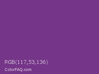 RGB 117,53,136 Color is a normal purple color and the nearest color is Maximum Purple #733380. Hex code #753588 and RGB value is rgb(117,53,136). In RGB color space, this color is composed of 46% red, 21% green, 53% blue, In CMYK color space, this color is composed of 14% cyan, 61% magenta, 0% yellow , 47% black , In HSL color space, this color has a hue angle of 286° , 44% saturation and 37% lightness.