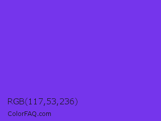 RGB 117,53,236 Color is a normal violet color and the nearest color is Blue Violet #8a2be2. Hex code #7535ec and RGB value is rgb(117,53,236). In RGB color space, this color is composed of 46% red, 21% green, 93% blue, In CMYK color space, this color is composed of 50% cyan, 78% magenta, 0% yellow , 7% black , In HSL color space, this color has a hue angle of 261° , 83% saturation and 57% lightness.