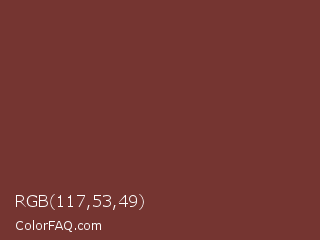 RGB 117,53,49 Color is a normal red color and the nearest color is Wine #722f37. Hex code #753531 and RGB value is rgb(117,53,49). In RGB color space, this color is composed of 46% red, 21% green, 19% blue, In CMYK color space, this color is composed of 0% cyan, 55% magenta, 58% yellow , 54% black , In HSL color space, this color has a hue angle of 4° , 41% saturation and 33% lightness.
