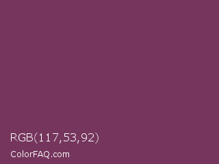 RGB 117,53,92 Color is a normal magenta color and the nearest color is Cosmic #76395d. Hex code #75355c and RGB value is rgb(117,53,92). In RGB color space, this color is composed of 46% red, 21% green, 36% blue, In CMYK color space, this color is composed of 0% cyan, 55% magenta, 21% yellow , 54% black , In HSL color space, this color has a hue angle of 323° , 38% saturation and 33% lightness.