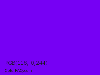 RGB 118,-0,244 Color is a normal violet color and the nearest color is Electric Indigo #6f00ff. Hex code #7600f4 and RGB value is rgb(118,-0,244). In RGB color space, this color is composed of 46% red, 0% green, 96% blue, In CMYK color space, this color is composed of 52% cyan, 100% magenta, 0% yellow , 4% black , In HSL color space, this color has a hue angle of 269° , 100% saturation and 48% lightness.