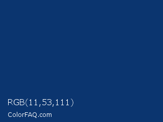 RGB 11,53,111 Color is a dark blue color and the nearest color is Midnight Blue #003366. Hex code #0b356f and RGB value is rgb(11,53,111). In RGB color space, this color is composed of 4% red, 21% green, 44% blue, In CMYK color space, this color is composed of 90% cyan, 52% magenta, 0% yellow , 56% black , In HSL color space, this color has a hue angle of 215° , 82% saturation and 24% lightness.