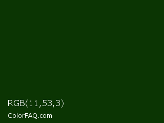 RGB 11,53,3 Color is a very dark green color and the nearest color is Deep Forest Green #182d09. Hex code #0b3503 and RGB value is rgb(11,53,3). In RGB color space, this color is composed of 4% red, 21% green, 1% blue, In CMYK color space, this color is composed of 79% cyan, 0% magenta, 94% yellow , 79% black , In HSL color space, this color has a hue angle of 110° , 89% saturation and 11% lightness.