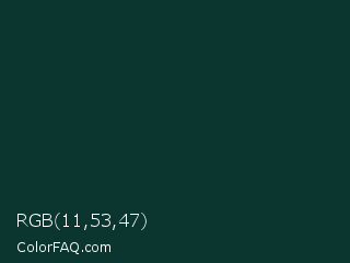RGB 11,53,47 Color is a very dark cyan color and the nearest color is Tiber #063537. Hex code #0b352f and RGB value is rgb(11,53,47). In RGB color space, this color is composed of 4% red, 21% green, 18% blue, In CMYK color space, this color is composed of 79% cyan, 0% magenta, 11% yellow , 79% black , In HSL color space, this color has a hue angle of 171° , 66% saturation and 13% lightness.