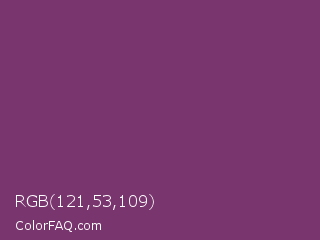 RGB 121,53,109 Color is a normal magenta color and the nearest color is Razzmic Berry Crayola #843179. Hex code #79356d and RGB value is rgb(121,53,109). In RGB color space, this color is composed of 47% red, 21% green, 43% blue, In CMYK color space, this color is composed of 0% cyan, 56% magenta, 10% yellow , 53% black , In HSL color space, this color has a hue angle of 311° , 39% saturation and 34% lightness.