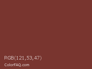 RGB 121,53,47 Color is a normal red color and the nearest color is Wine #722f37. Hex code #79352f and RGB value is rgb(121,53,47). In RGB color space, this color is composed of 47% red, 21% green, 18% blue, In CMYK color space, this color is composed of 0% cyan, 56% magenta, 61% yellow , 53% black , In HSL color space, this color has a hue angle of 5° , 44% saturation and 33% lightness.