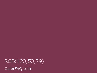 RGB 123,53,79 Color is a normal rose color and the nearest color is Cosmic #76395d. Hex code #7b354f and RGB value is rgb(123,53,79). In RGB color space, this color is composed of 48% red, 21% green, 31% blue, In CMYK color space, this color is composed of 0% cyan, 57% magenta, 36% yellow , 52% black , In HSL color space, this color has a hue angle of 338° , 40% saturation and 35% lightness.