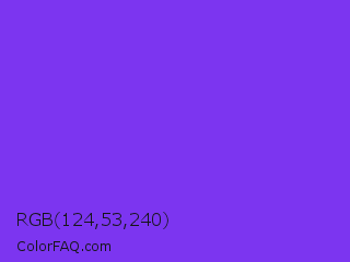RGB 124,53,240 Color is a normal violet color and the nearest color is Blue Violet #8a2be2. Hex code #7c35f0 and RGB value is rgb(124,53,240). In RGB color space, this color is composed of 49% red, 21% green, 94% blue, In CMYK color space, this color is composed of 48% cyan, 78% magenta, 0% yellow , 6% black , In HSL color space, this color has a hue angle of 263° , 86% saturation and 57% lightness.