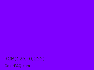 RGB 126,-0,255 Color is a normal violet color and the nearest color is Violet Color Wheel #7f00ff. Hex code #7e00ff and RGB value is rgb(126,-0,255). In RGB color space, this color is composed of 49% red, 0% green, 100% blue, In CMYK color space, this color is composed of 51% cyan, 100% magenta, 0% yellow , 0% black , In HSL color space, this color has a hue angle of 270° , 100% saturation and 50% lightness.