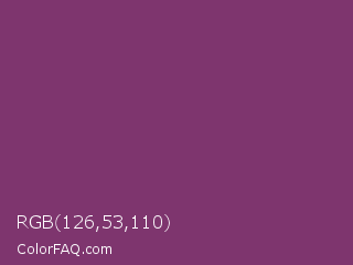 RGB 126,53,110 Color is a normal magenta color and the nearest color is Razzmic Berry Crayola #843179. Hex code #7e356e and RGB value is rgb(126,53,110). In RGB color space, this color is composed of 49% red, 21% green, 43% blue, In CMYK color space, this color is composed of 0% cyan, 58% magenta, 13% yellow , 51% black , In HSL color space, this color has a hue angle of 313° , 41% saturation and 35% lightness.