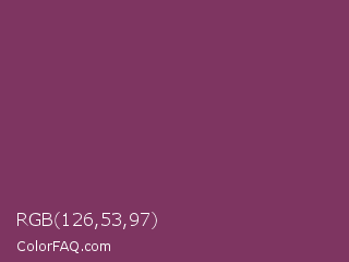 RGB 126,53,97 Color is a normal magenta color and the nearest color is Boysenberry #873260. Hex code #7e3561 and RGB value is rgb(126,53,97). In RGB color space, this color is composed of 49% red, 21% green, 38% blue, In CMYK color space, this color is composed of 0% cyan, 58% magenta, 23% yellow , 51% black , In HSL color space, this color has a hue angle of 324° , 41% saturation and 35% lightness.