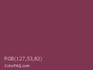 RGB 127,53,82 Color is a normal rose color and the nearest color is Camelot #893456. Hex code #7f3552 and RGB value is rgb(127,53,82). In RGB color space, this color is composed of 50% red, 21% green, 32% blue, In CMYK color space, this color is composed of 0% cyan, 58% magenta, 35% yellow , 50% black , In HSL color space, this color has a hue angle of 336° , 41% saturation and 35% lightness.