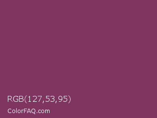RGB 127,53,95 Color is a normal magenta color and the nearest color is Boysenberry #873260. Hex code #7f355f and RGB value is rgb(127,53,95). In RGB color space, this color is composed of 50% red, 21% green, 37% blue, In CMYK color space, this color is composed of 0% cyan, 58% magenta, 25% yellow , 50% black , In HSL color space, this color has a hue angle of 326° , 41% saturation and 35% lightness.