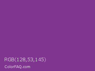 RGB 128,53,145 Color is a normal purple color and the nearest color is Vivid Violet #803790. Hex code #803591 and RGB value is rgb(128,53,145). In RGB color space, this color is composed of 50% red, 21% green, 57% blue, In CMYK color space, this color is composed of 12% cyan, 63% magenta, 0% yellow , 43% black , In HSL color space, this color has a hue angle of 289° , 46% saturation and 39% lightness.