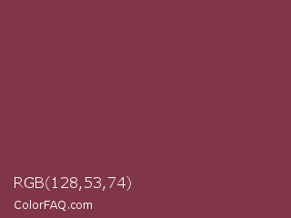 RGB 128,53,74 Color is a normal rose color and the nearest color is Solid Pink #893843. Hex code #80354a and RGB value is rgb(128,53,74). In RGB color space, this color is composed of 50% red, 21% green, 29% blue, In CMYK color space, this color is composed of 0% cyan, 59% magenta, 42% yellow , 50% black , In HSL color space, this color has a hue angle of 343° , 41% saturation and 35% lightness.