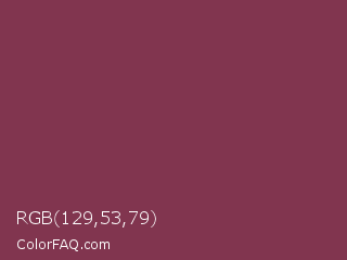RGB 129,53,79 Color is a normal rose color and the nearest color is Camelot #893456. Hex code #81354f and RGB value is rgb(129,53,79). In RGB color space, this color is composed of 51% red, 21% green, 31% blue, In CMYK color space, this color is composed of 0% cyan, 59% magenta, 39% yellow , 49% black , In HSL color space, this color has a hue angle of 339° , 42% saturation and 36% lightness.