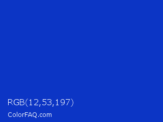 RGB 12,53,197 Color is a normal blue color and the nearest color is Persian Blue #1c39bb. Hex code #0c35c5 and RGB value is rgb(12,53,197). In RGB color space, this color is composed of 5% red, 21% green, 77% blue, In CMYK color space, this color is composed of 94% cyan, 73% magenta, 0% yellow , 23% black , In HSL color space, this color has a hue angle of 227° , 89% saturation and 41% lightness.