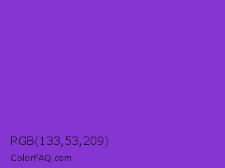 RGB 133,53,209 Color is a normal purple color and the nearest color is Blue Violet #8a2be2. Hex code #8535d1 and RGB value is rgb(133,53,209). In RGB color space, this color is composed of 52% red, 21% green, 82% blue, In CMYK color space, this color is composed of 36% cyan, 75% magenta, 0% yellow , 18% black , In HSL color space, this color has a hue angle of 271° , 63% saturation and 51% lightness.