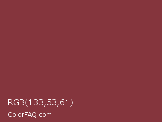 RGB 133,53,61 Color is a normal red color and the nearest color is Lotus #863c3c. Hex code #85353d and RGB value is rgb(133,53,61). In RGB color space, this color is composed of 52% red, 21% green, 24% blue, In CMYK color space, this color is composed of 0% cyan, 60% magenta, 54% yellow , 48% black , In HSL color space, this color has a hue angle of 354° , 43% saturation and 36% lightness.