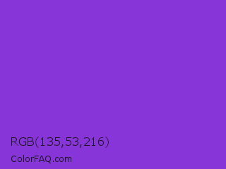 RGB 135,53,216 Color is a normal violet color and the nearest color is Blue Violet #8a2be2. Hex code #8735d8 and RGB value is rgb(135,53,216). In RGB color space, this color is composed of 53% red, 21% green, 85% blue, In CMYK color space, this color is composed of 38% cyan, 75% magenta, 0% yellow , 15% black , In HSL color space, this color has a hue angle of 270° , 68% saturation and 53% lightness.