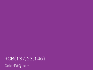 RGB 137,53,146 Color is a normal magenta color and the nearest color is Vivid Violet #803790. Hex code #893592 and RGB value is rgb(137,53,146). In RGB color space, this color is composed of 54% red, 21% green, 57% blue, In CMYK color space, this color is composed of 6% cyan, 64% magenta, 0% yellow , 43% black , In HSL color space, this color has a hue angle of 294° , 47% saturation and 39% lightness.
