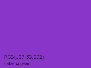 RGB 137,53,202 Color is a normal purple color and the nearest color is Dark Orchid #9932cc. Hex code #8935ca and RGB value is rgb(137,53,202). In RGB color space, this color is composed of 54% red, 21% green, 79% blue, In CMYK color space, this color is composed of 32% cyan, 74% magenta, 0% yellow , 21% black , In HSL color space, this color has a hue angle of 274° , 58% saturation and 50% lightness.