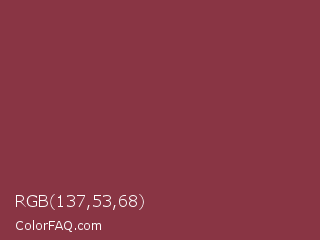 RGB 137,53,68 Color is a normal red color and the nearest color is Solid Pink #893843. Hex code #893544 and RGB value is rgb(137,53,68). In RGB color space, this color is composed of 54% red, 21% green, 27% blue, In CMYK color space, this color is composed of 0% cyan, 61% magenta, 50% yellow , 46% black , In HSL color space, this color has a hue angle of 349° , 44% saturation and 37% lightness.