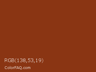 RGB 138,53,19 Color is a normal orange color and the nearest color is Kobe #882d17. Hex code #8a3513 and RGB value is rgb(138,53,19). In RGB color space, this color is composed of 54% red, 21% green, 7% blue, In CMYK color space, this color is composed of 0% cyan, 62% magenta, 86% yellow , 46% black , In HSL color space, this color has a hue angle of 17° , 76% saturation and 31% lightness.