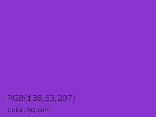 RGB 138,53,207 Color is a normal purple color and the nearest color is Dark Orchid #9932cc. Hex code #8a35cf and RGB value is rgb(138,53,207). In RGB color space, this color is composed of 54% red, 21% green, 81% blue, In CMYK color space, this color is composed of 33% cyan, 74% magenta, 0% yellow , 19% black , In HSL color space, this color has a hue angle of 273° , 62% saturation and 51% lightness.