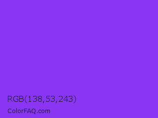 RGB 138,53,243 Color is a normal violet color and the nearest color is Blue Violet #8a2be2. Hex code #8a35f3 and RGB value is rgb(138,53,243). In RGB color space, this color is composed of 54% red, 21% green, 95% blue, In CMYK color space, this color is composed of 43% cyan, 78% magenta, 0% yellow , 5% black , In HSL color space, this color has a hue angle of 267° , 89% saturation and 58% lightness.